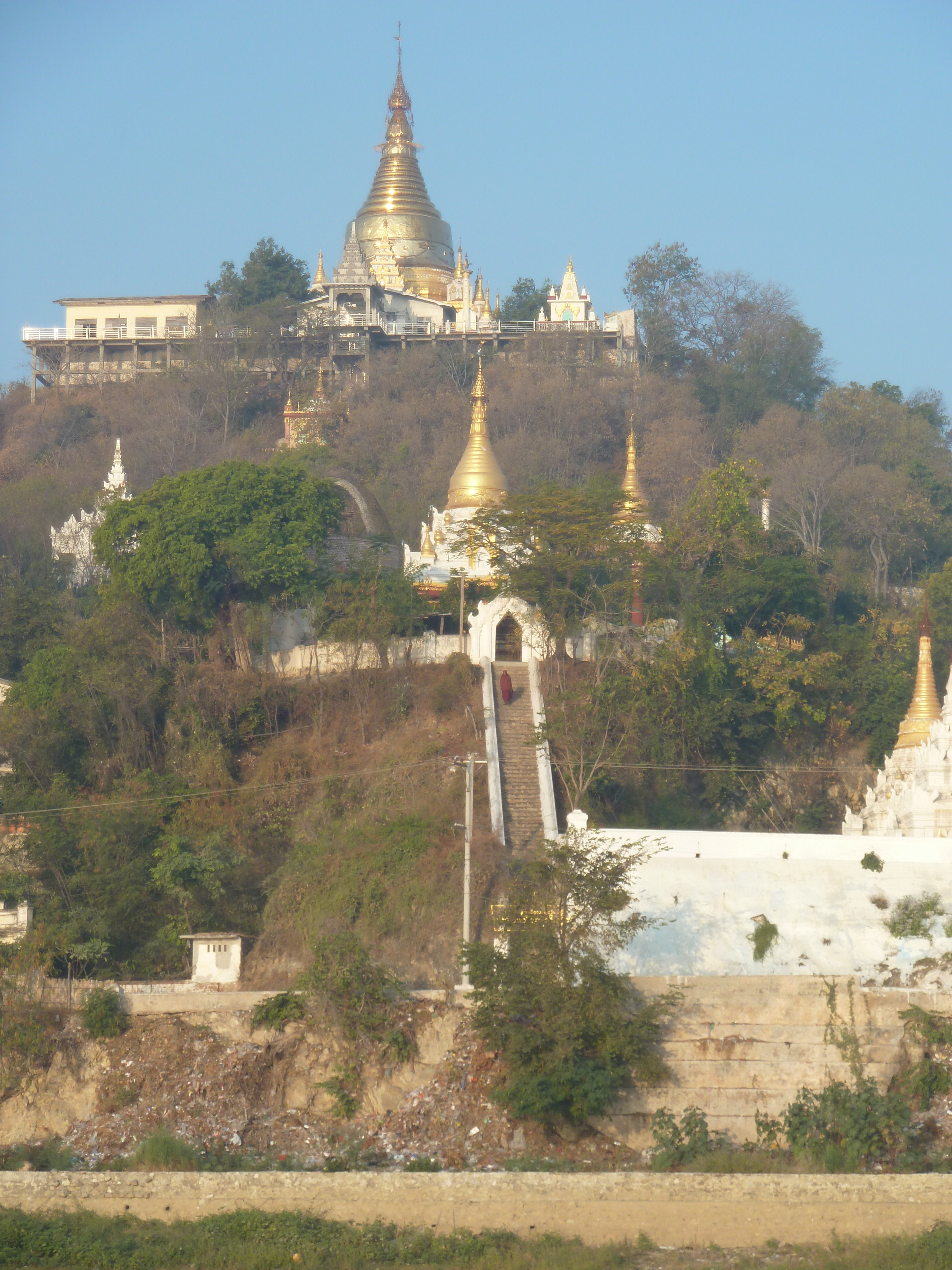Monk on the stairway to a stupa
